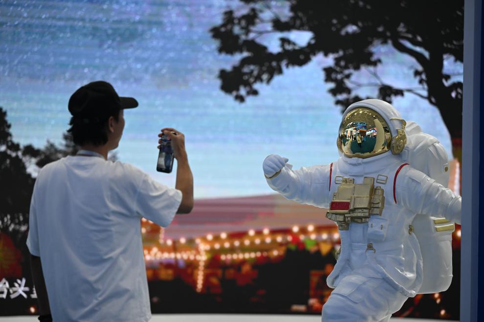 一名观展者为乌兰察布火山“宇航员”拍照。唐璇博 摄
