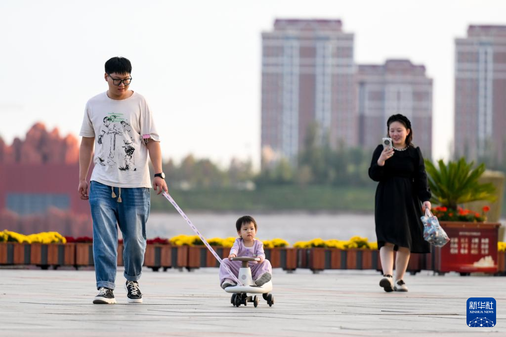 9月19日,市民在康巴什区乌兰木伦湖边的广场玩耍。