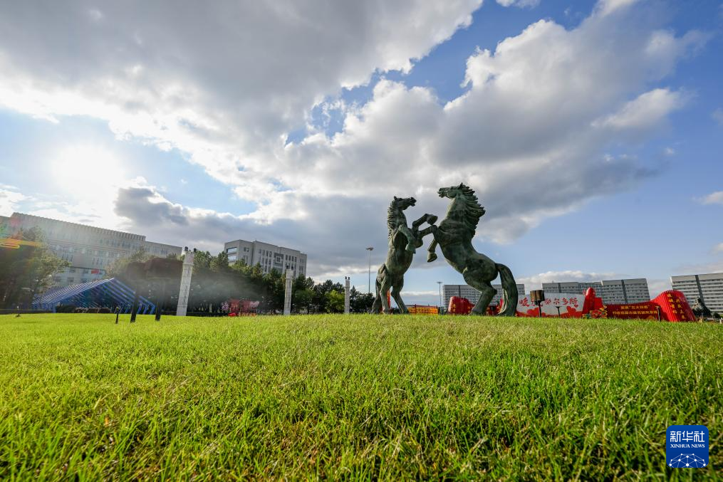 这是9月20日拍摄的康巴什双驹广场上的雕塑。