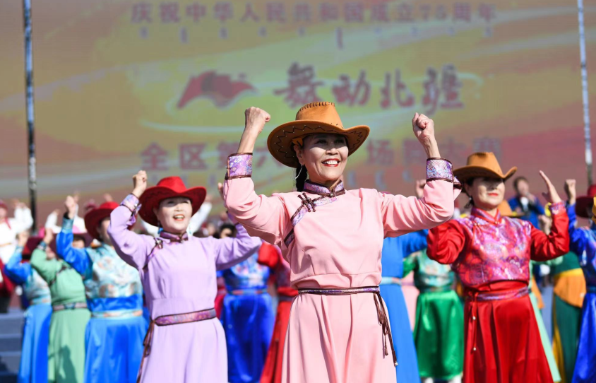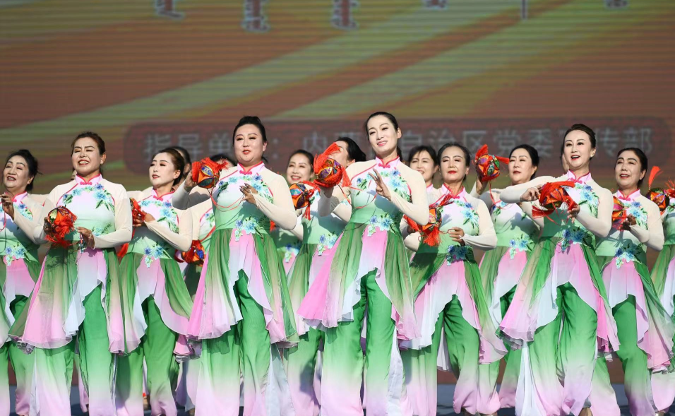 赛前,全体人员高唱《歌唱祖国》,激昂的旋律、嘹亮的歌声,表达了大家对祖国的无限热爱和深深祝福。紧接着,千人广场舞表演《中华民族一家亲》震撼登场,由内蒙古各地参赛代表队与各群众文艺团队及文化志愿者们携手共舞。