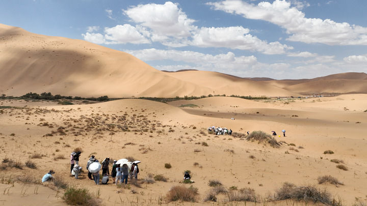 2024年7月31日,来自兰州大学、香港浸会大学、西南大学等18所高校的100余位师生在巴丹吉林沙漠开展“发现计划”地理学联合实习,这是部分师生在巴丹吉林沙漠中开展植被样方调查(无人机照片)。新华社记者 贝赫 摄
