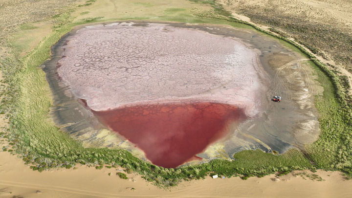 2024年7月30日拍摄的巴丹吉林沙漠中的红海子(无人机照片)。新华社记者 贝赫 摄