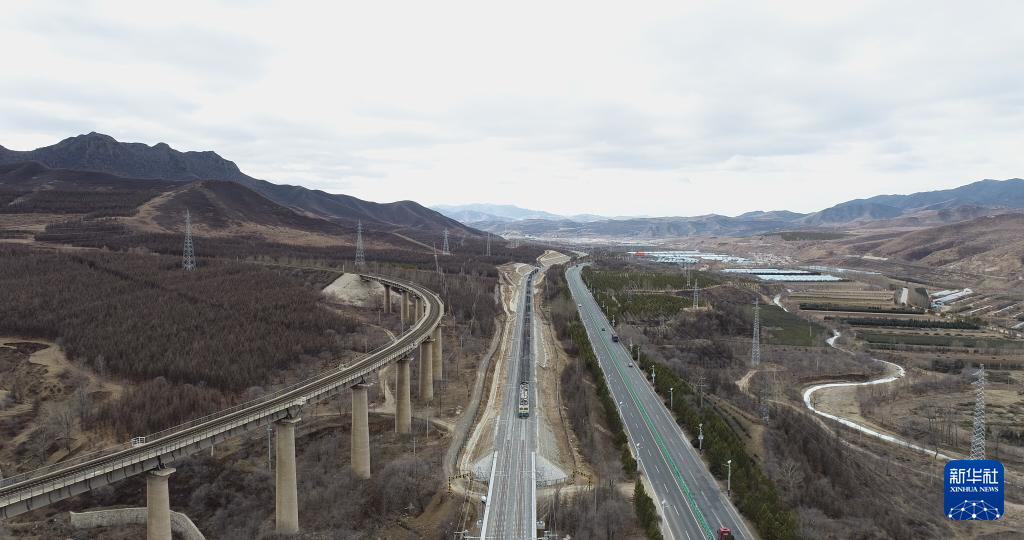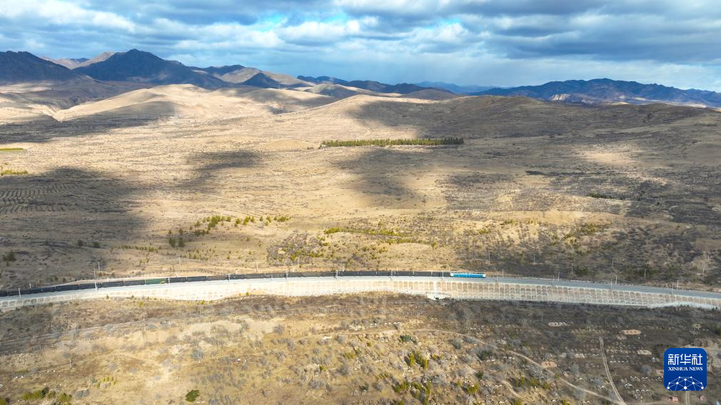 11月21日,在内蒙古赤峰市克什克腾旗,一列由电力机车牵引的货运列车行驶在内蒙古集通铁路多伦河特大桥至经棚隧道区间(无人机照片)。