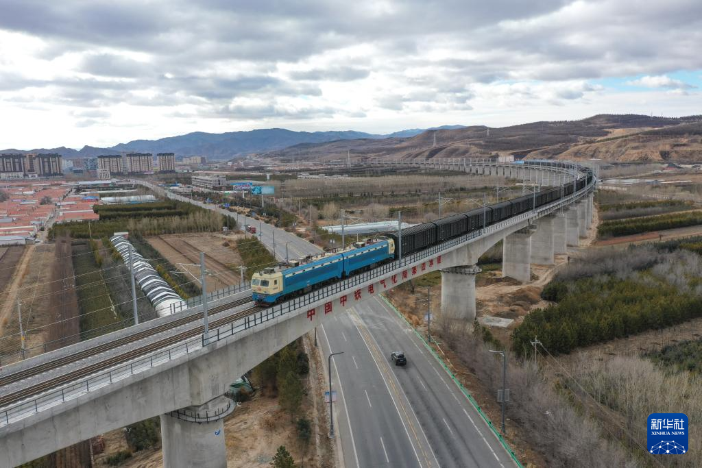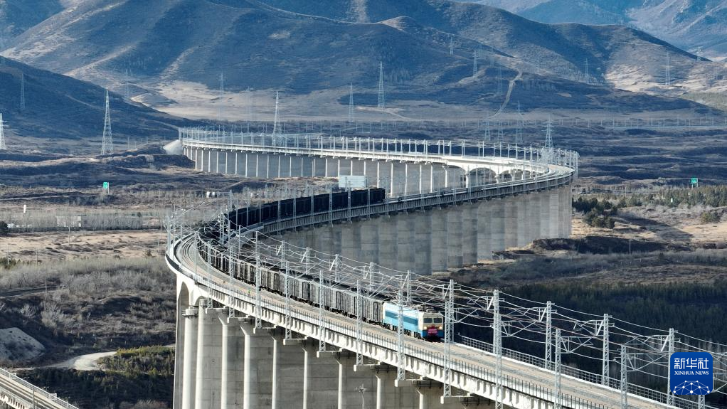 11月21日,在内蒙古赤峰市克什克腾旗,一列由电力机车牵引的货运列车行驶在内蒙古集通铁路经棚特大桥上(无人机照片)。