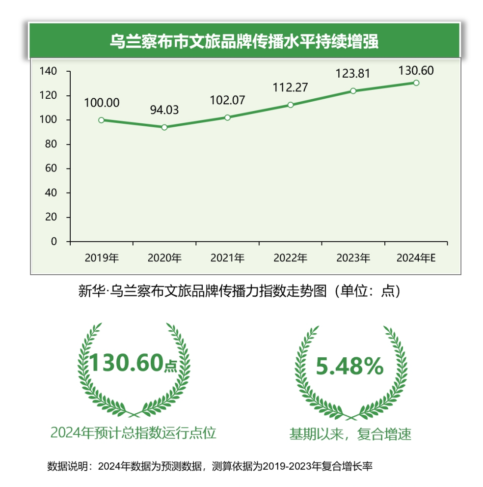 近日,新华指数研究院发布的《新华·乌兰察布文旅品牌传播力》指数报告全景呈现出乌兰察布文旅出圈之路。报告显示,乌兰察布文旅品牌传播力总指数在2023年达到123.81点,预计2024年总指数运行点位可达130.60点,基期以来复合增速5.48%。这一增长得益于乌兰察布市在文旅资源深度挖掘、产业发展势能强劲、品牌支撑不断完善、城市名片持续擦亮以及文旅融合纵深推进等方面的努力。