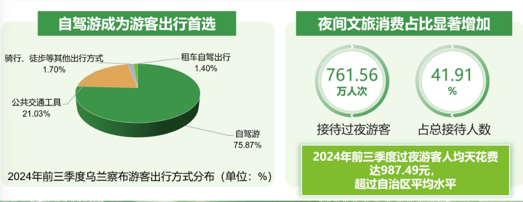 报告指出,乌兰察布市旅游市场的主要特征分析显示,20-49岁人群成为游客主力军,租车自驾游成为游客首选,夜间文旅消费占比显著增加,这些旅游消费新变化和新趋势,为乌兰察布市文旅市场注入新活力。从民宿酒店消费数据来看,乌兰察布市接待过夜游客人均每天花费超过内蒙古自治区平均水平,显示出民宿酒店消费需求的集中释放。