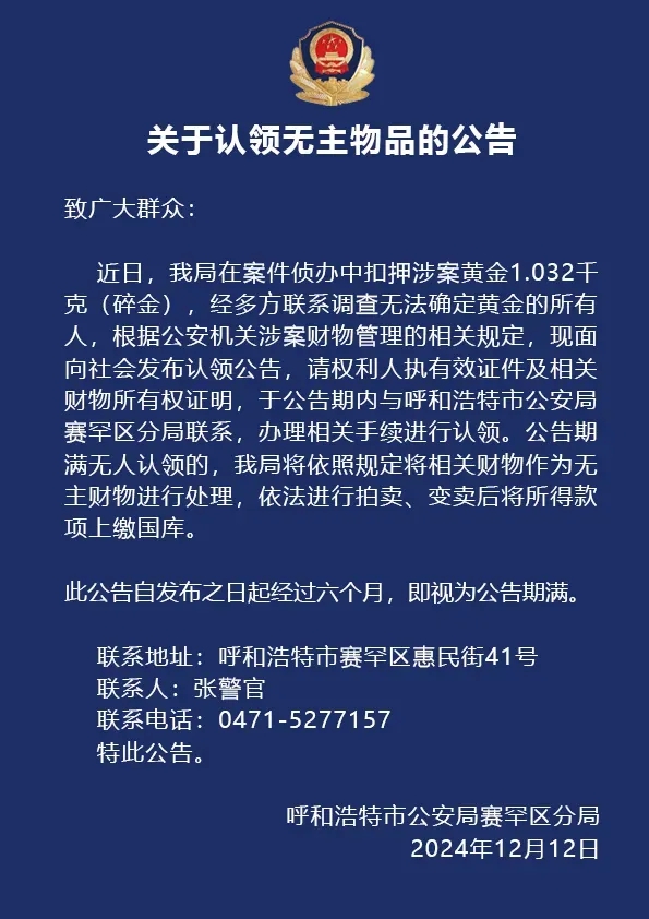 近日,赛罕区分局在案件侦办中扣押涉案黄金1.032千克(碎金),经多方联系调查无法确定黄金的所有人,根据公安机关涉案财物管理的相关规定,现面向社会发布认领公告,请权利人执有效证件及相关财物所有权证明,于公告期内与呼和浩特市公安局赛罕区分局联系,办理相关手续进行认领。