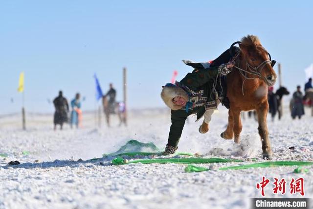 12月28日,内蒙古锡林郭勒,选手参加跑马拾哈达比赛。中新社记者 刘文华 摄