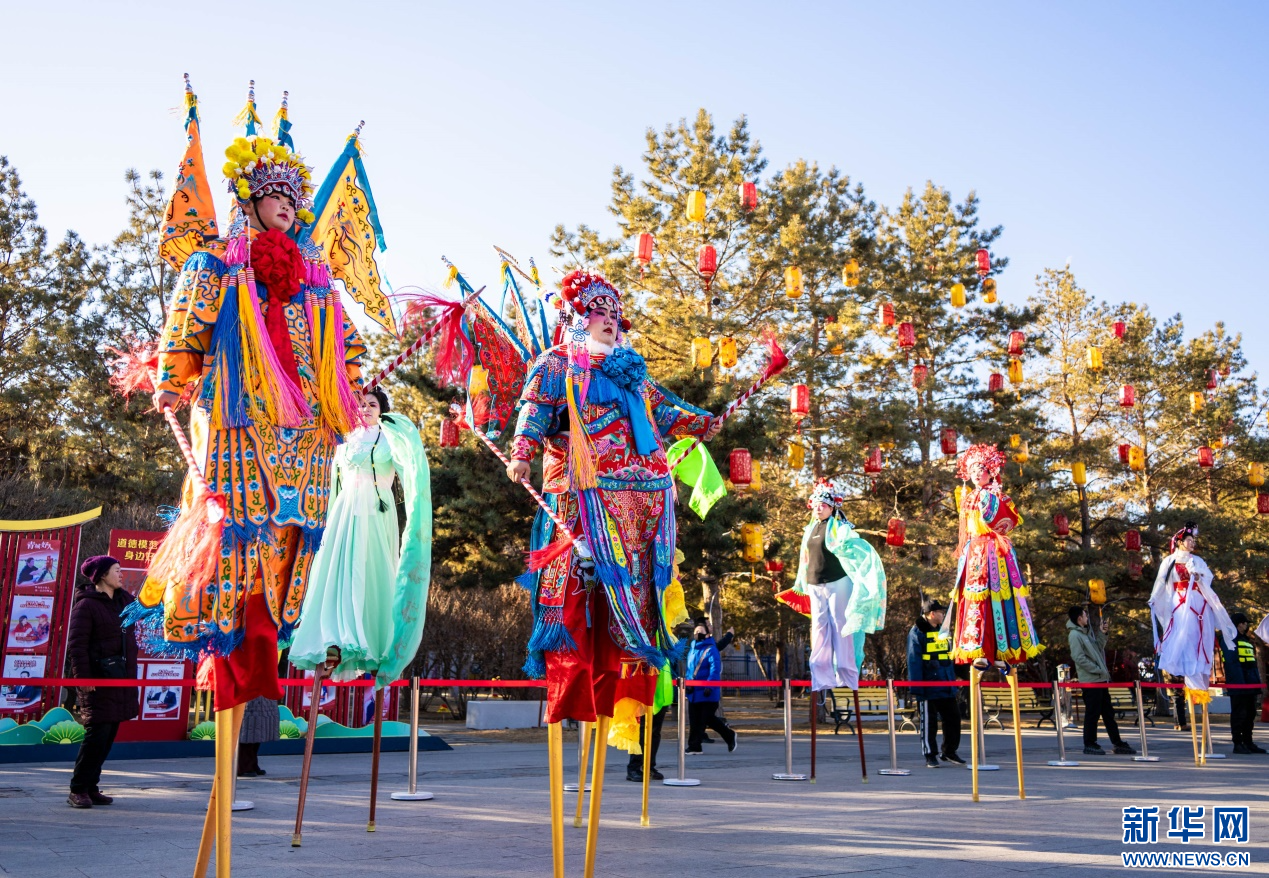 1月22日,民间艺人在呼和浩特市春节主题活动现场为游客表演高跷。新华网发(丁根厚 摄)
