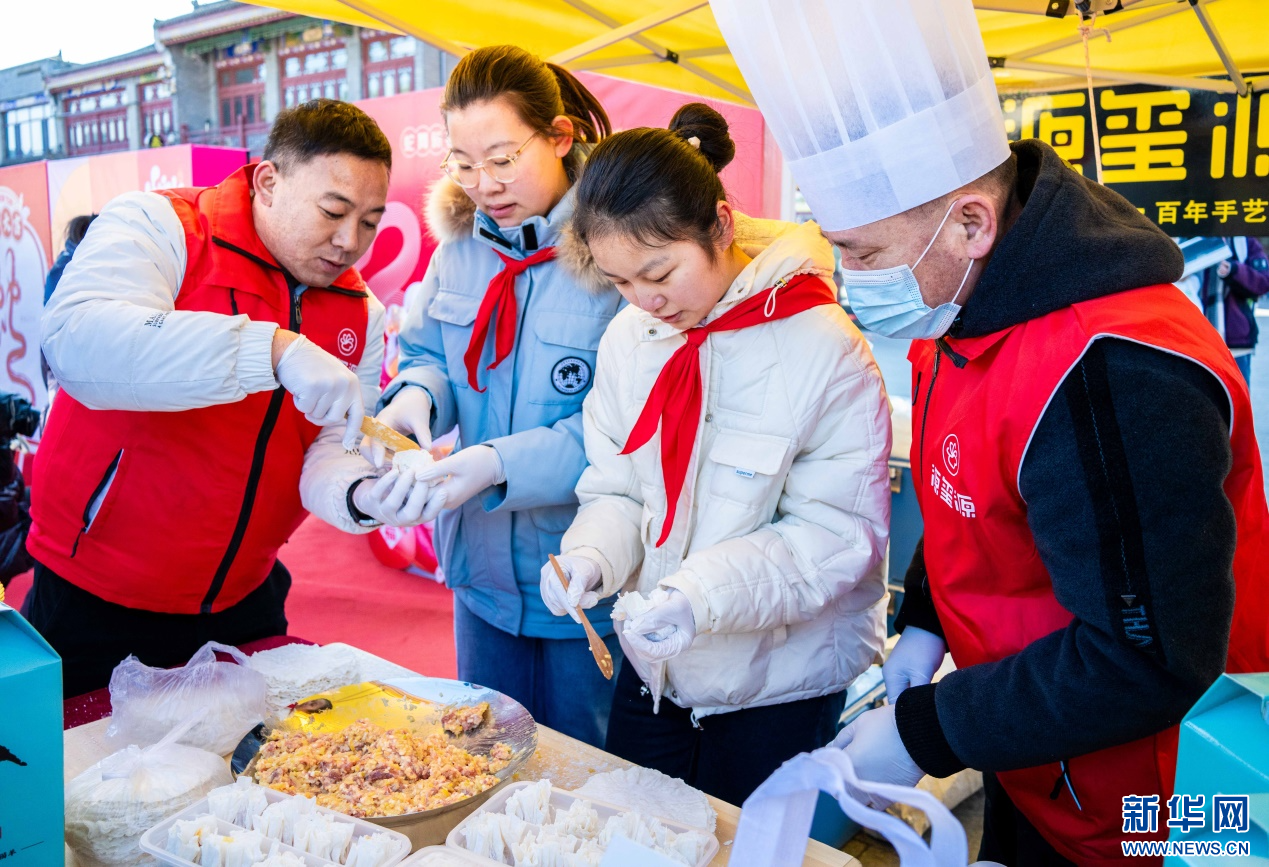 1月22日,小朋友在呼和浩特市春节主题活动现场体验非遗烧卖的制作技艺。新华网发(丁根厚 摄)