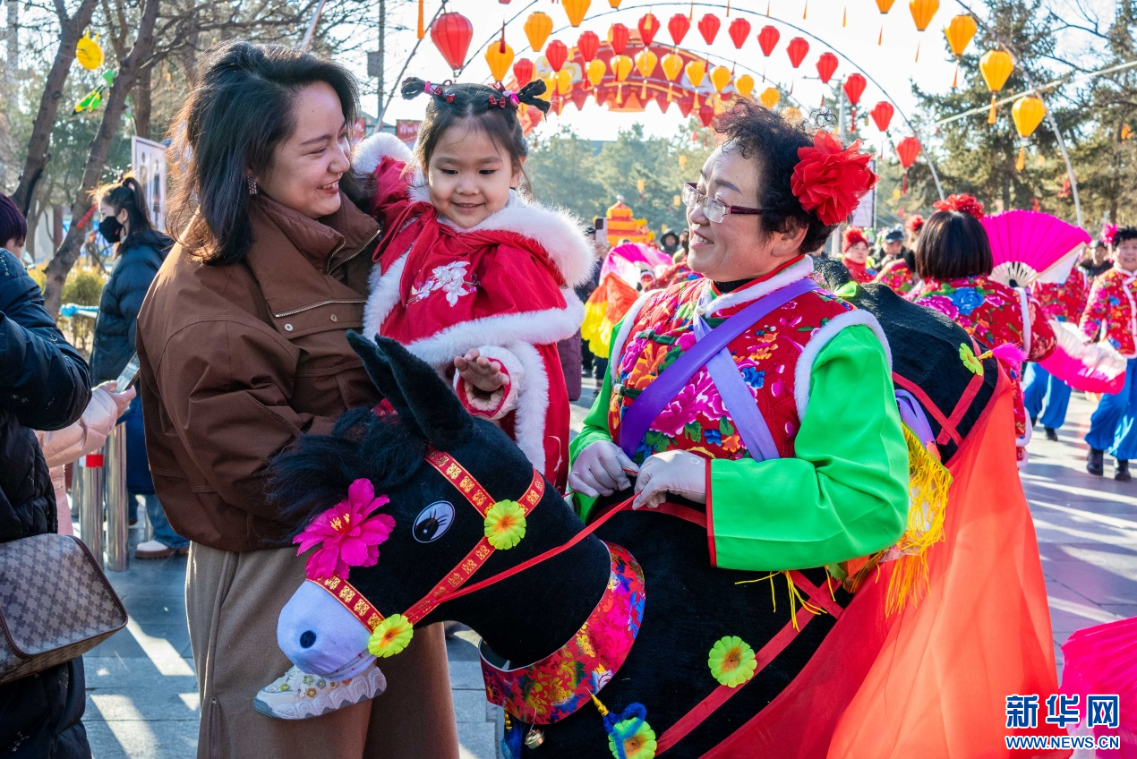 1月22日,秧歌表演者在呼和浩特市春节主题活动现场与游客互动。新华网发(丁根厚 摄)