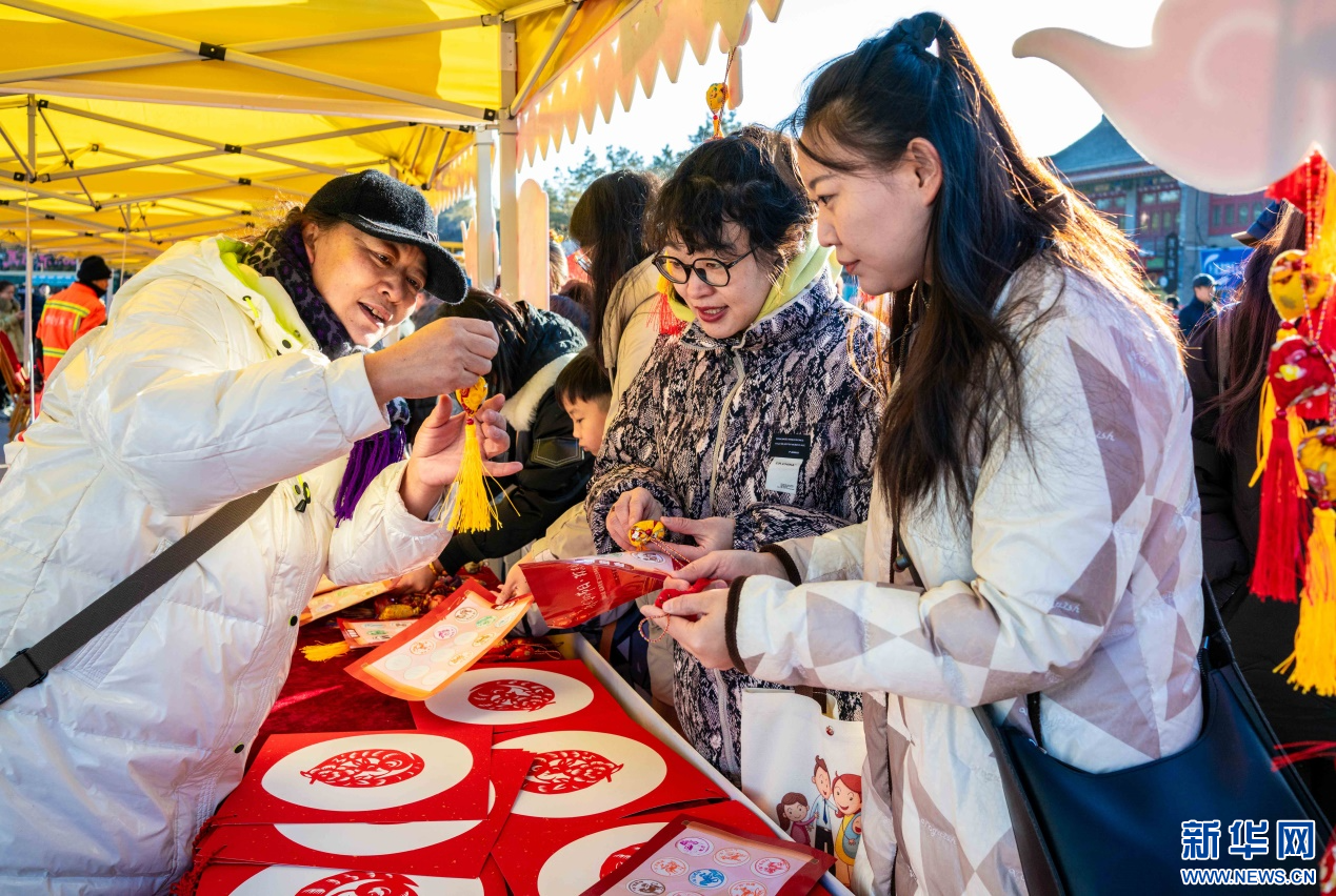 1月22日,游客在呼和浩特市春节主题活动现场向非遗传承人了解生肖蛇福袋的制作技艺。新华网发(丁根厚 摄)