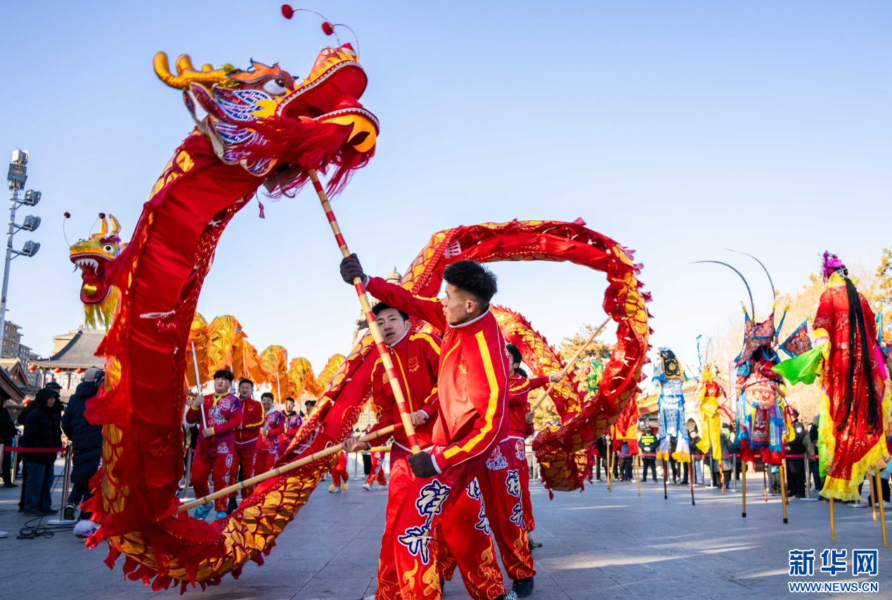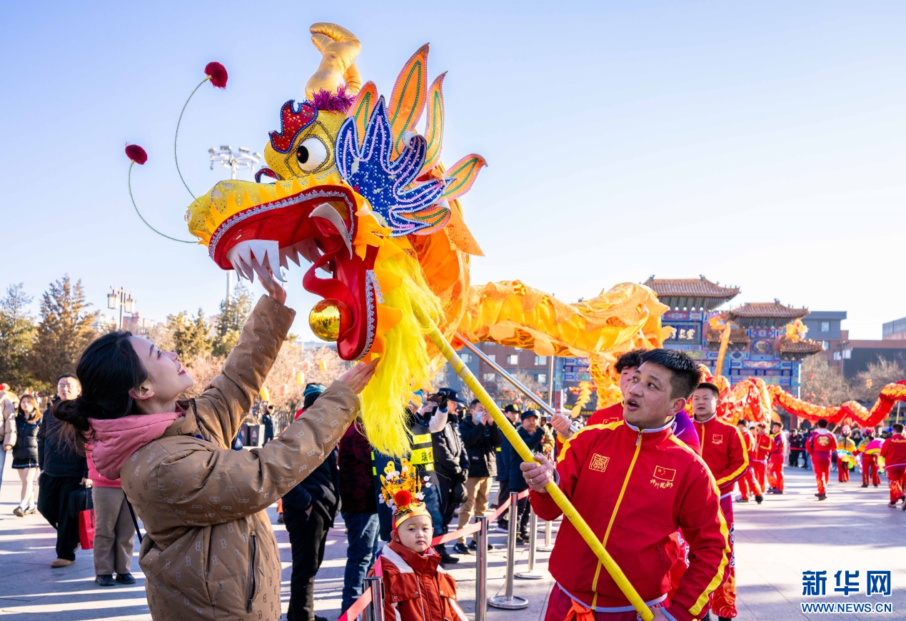 1月22日,舞龙表演者在呼和浩特市春节主题活动现场与游客互动。新华网发(丁根厚 摄)