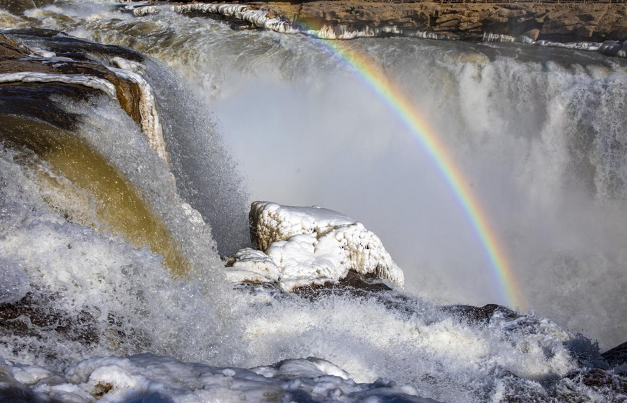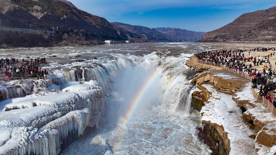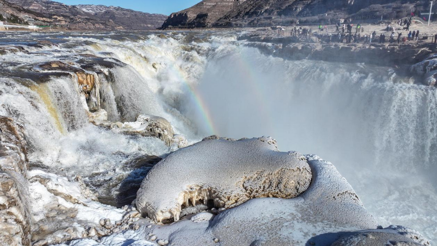 2月6日,受近日持续降温天气影响,位于秦晋大峡谷的陕西壶口瀑布景区出现冰瀑玉壶景观。从空中俯瞰,滔滔黄河水奔腾咆哮,场面蔚为壮观,飞溅起的浪花和弥漫的水雾在两岸岩石和护栏上迅速凝结,形成形状各异的冰挂,晶莹剔透,美不胜收,飞瀑上空偶现的彩虹与冰挂同框,交相辉映。由于近期黄河水流量上涨,达到700立方米每秒,景区主侧瀑布携手倾泻,呈现“90版50元人民币”上的壮美瀑布景观,游客一次旅程可观看双瀑奇观。