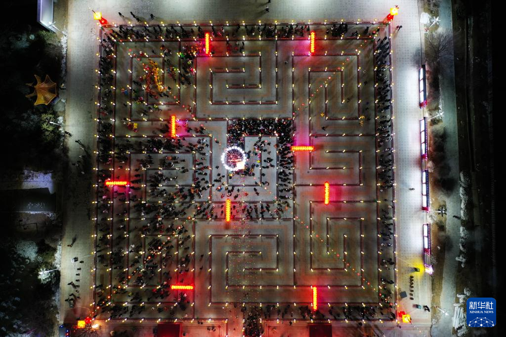 2月11日,游客在卓资县九曲广场体验“绕九曲”活动(无人机照片)。