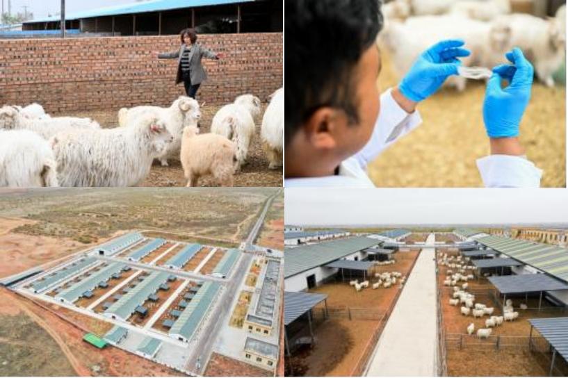 左下、右下:2023年4月27日拍摄的伊金霍洛旗苏布尔嘎镇敏盖绒山羊原种繁育中心。新华社记者 李志鹏