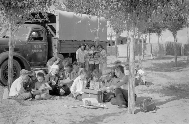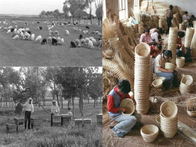 左下:1985年,数以百计的养蜂人从南方来到伊金霍洛旗草原放蜂酿蜜。十年前,这里还是不毛之地的霍洛流沙滩,而今林茂草丰,百花盛开。(1985年10月11日发)新华社记者 杨慎和 摄