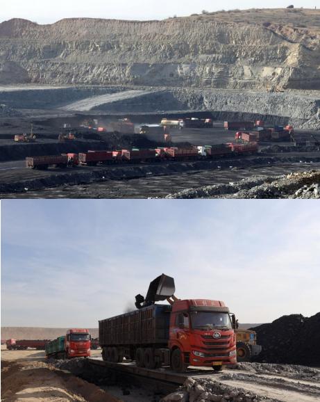下图:2021年11月18日,在伊金霍洛旗境内的荣恒煤矿,拉煤卡车在排队装煤。新华社记者 贾立君 摄