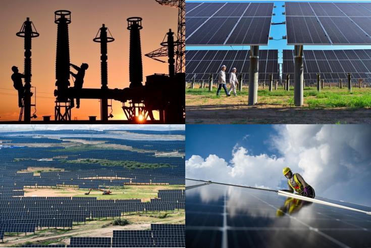 右下:2021年7月13日,工人为天骄绿能50万千瓦光伏发电项目安装光伏板。