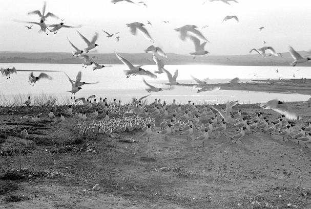 伊金霍洛旗和东胜市交界处的湖区,是我国遗鸥栖息、繁殖最大的地区之一,当时遗鸥达6000多只。图为漠地湖泊边的遗鸥群。(1996年7月5日发)新华社记者 施长江 摄