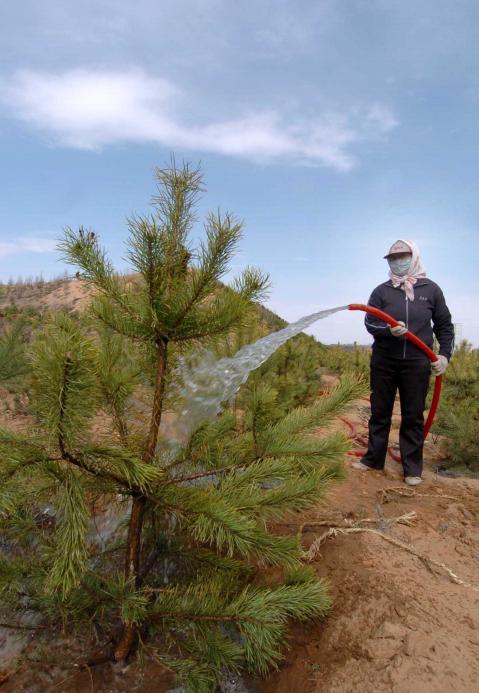 2007年4月13日,一名妇女在伊金霍洛旗乌兰木伦镇附近的沙地上为刚刚种植的油松浇水。