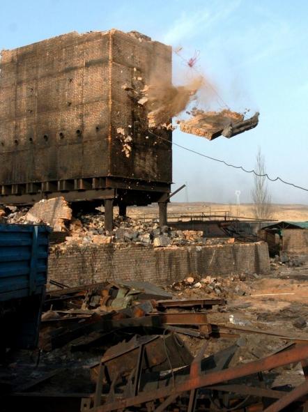 2006年4月21日,伊金霍洛旗乌兰木伦镇一家焦化厂的焦化炉正被拆毁。当日,伊金霍洛旗全面治理煤焦化行业,勒令全旗不符合环保要求的焦化厂于当年5月1日前全部停产,并计划于当年6月20日前全部拆除污染环境的焦化炉。新华社记者 摄