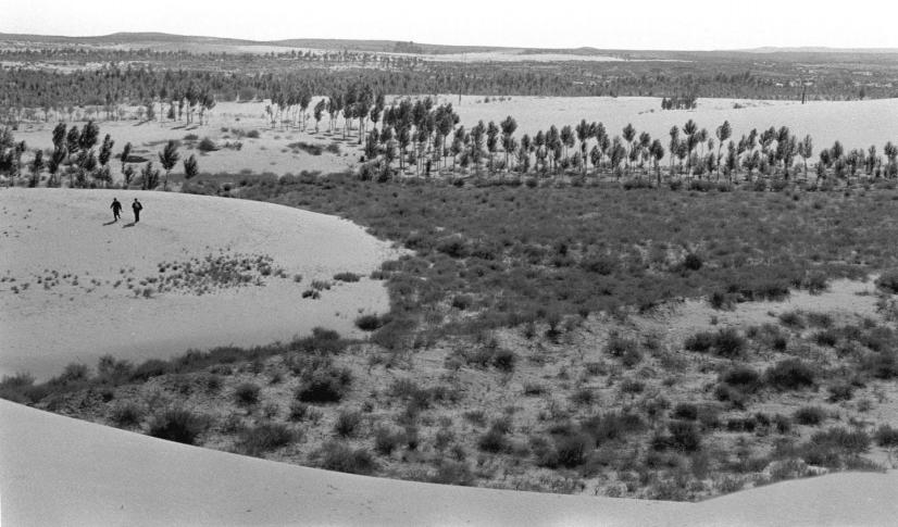 位于鄂尔多斯高原沙漠地区的伊金霍洛林场的林带(1977年7月19日摄)。内蒙古自治区植树造林,治理沙漠,保护农牧业生产。新华社记者 施长江 摄