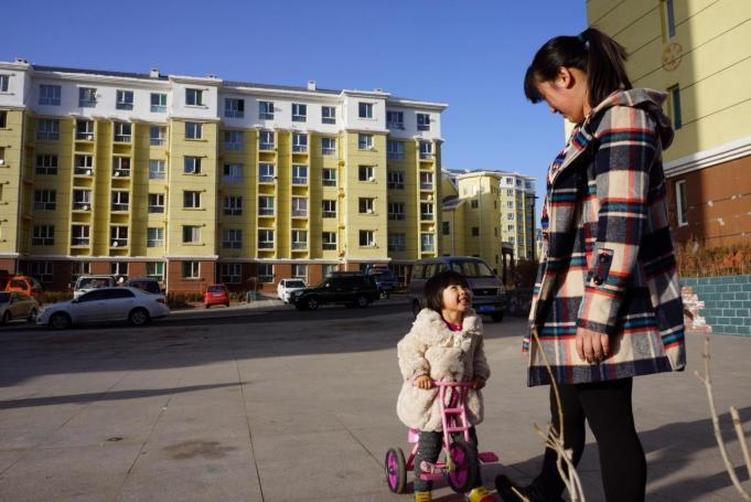2016年3月5日,一位母亲与孩子在伊金霍洛旗的保障房小区内玩耍。