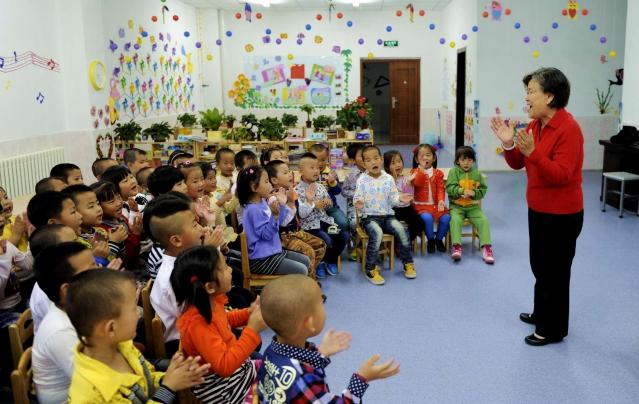 2012年10月8日,苏桂荣教伊金霍洛旗第四幼儿园的小朋友们唱儿歌。在教育岗位工作了35年的苏桂荣退休不退岗,仍旧奔波于各学校、幼儿园,为孩子编写儿歌,深受孩子们喜欢,被亲切地称为“儿歌奶奶”。新华社记者 赵婷婷 摄