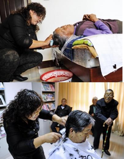 2008年,乌海人武巧霞随丈夫来到伊金霍洛旗生活,并开了一个小理发店。她坚持每月两次义务为伊金霍洛旗蒙程综合福利院里的近200名60岁到90多岁的老人理发,老人们都把她当做了自己的“亲女儿”(2012年9月30日摄)。新华社记者 赵婷婷 摄