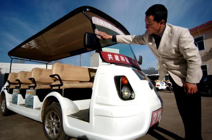 2007年4月13日,一名司机在清洁电瓶公交车。从2005年8月22日起,伊金霍洛旗阿勒腾席热镇推行免费公交车制度,相继购置近30辆电瓶车投入运营,方便居民出行。当时,该旗免费公交车开设的4条便民线路基本覆盖了阿勒腾席热镇区。新华社记者 任军川 摄