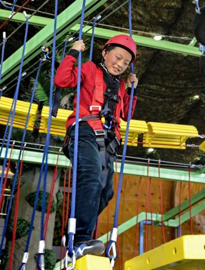 2013年3月3日,一名小学生在伊金霍洛旗通格朗社区服务中心进行拓展训练。该社区重点开发青少年“5+2”成长服务模式,让孩子们每周在5天学校教育之余,通过2天社区兴趣体验学习,开拓视野、健康成长。新华社记者 赵婷婷 摄