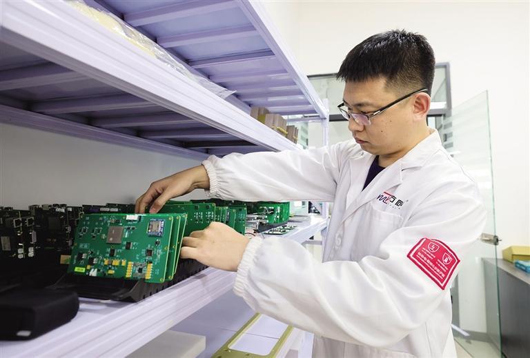 内蒙古方向图科技有限公司工程师在研发车间整理生产的电路板。