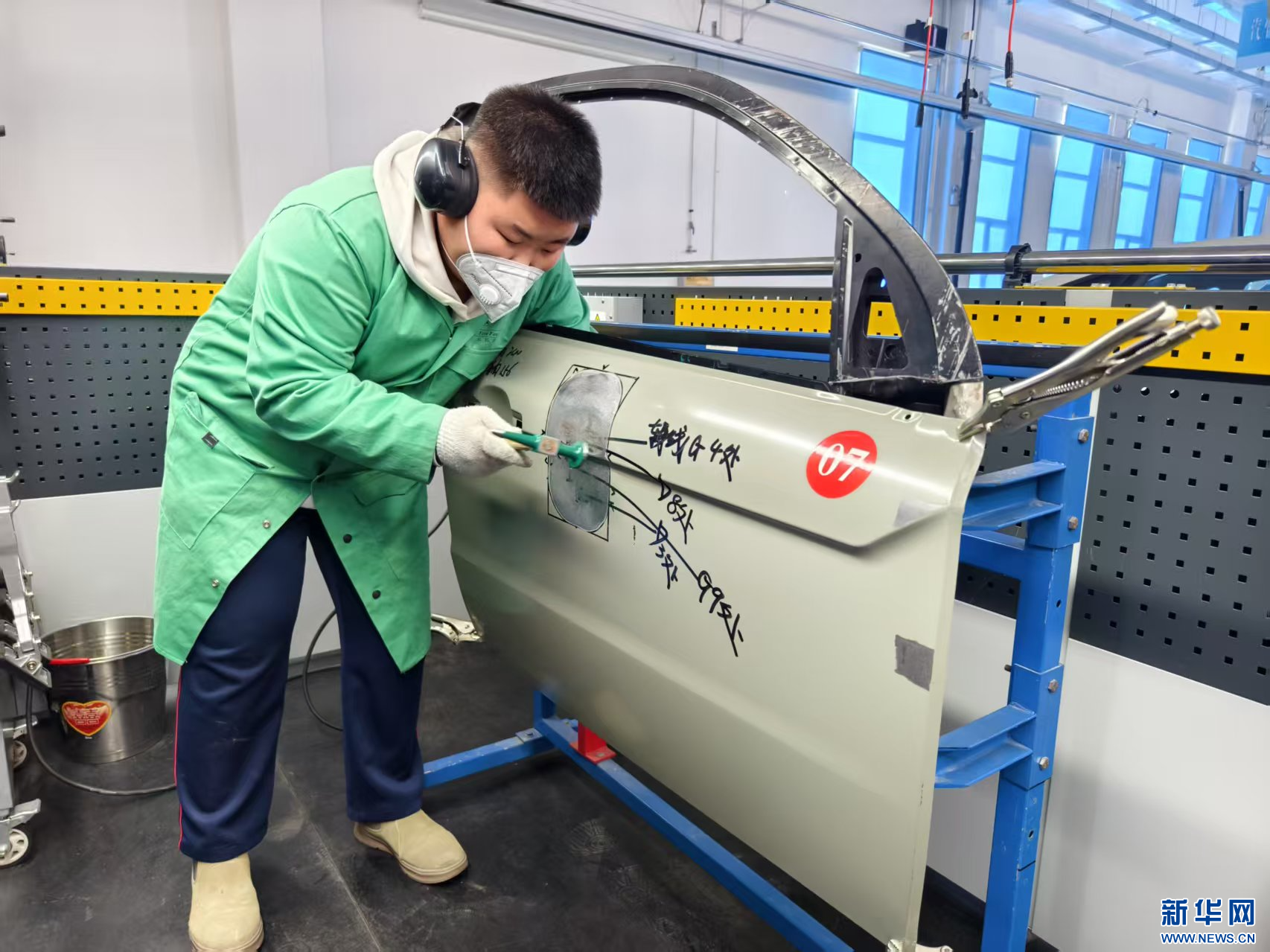 3月15日,准格尔旗职业高级中学学生在做汽车钣金修复学习。新华网 杨腾格尔 摄
