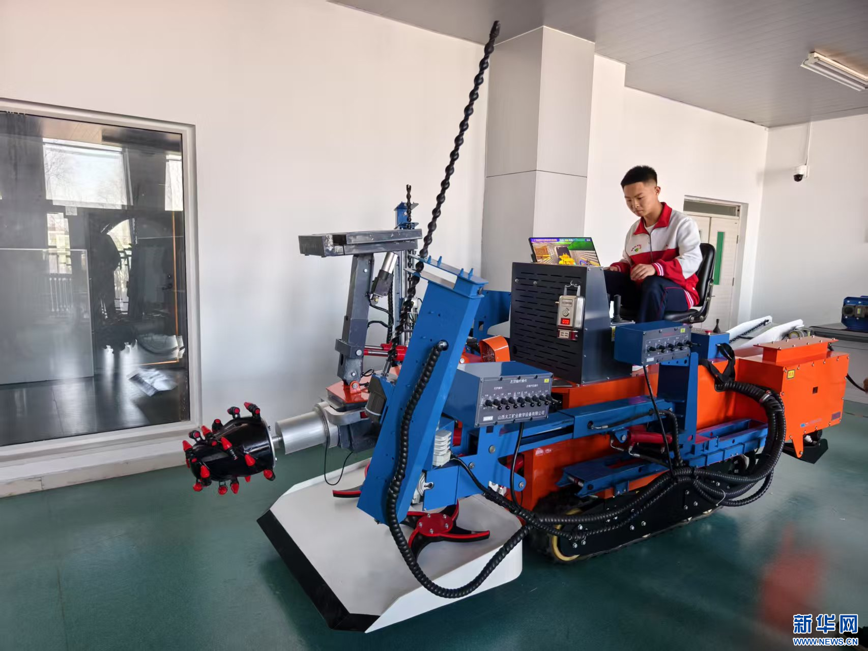 3月15日,准格尔旗职业高级中学学生进行模拟采煤作业练习。新华网 杨腾格尔 摄