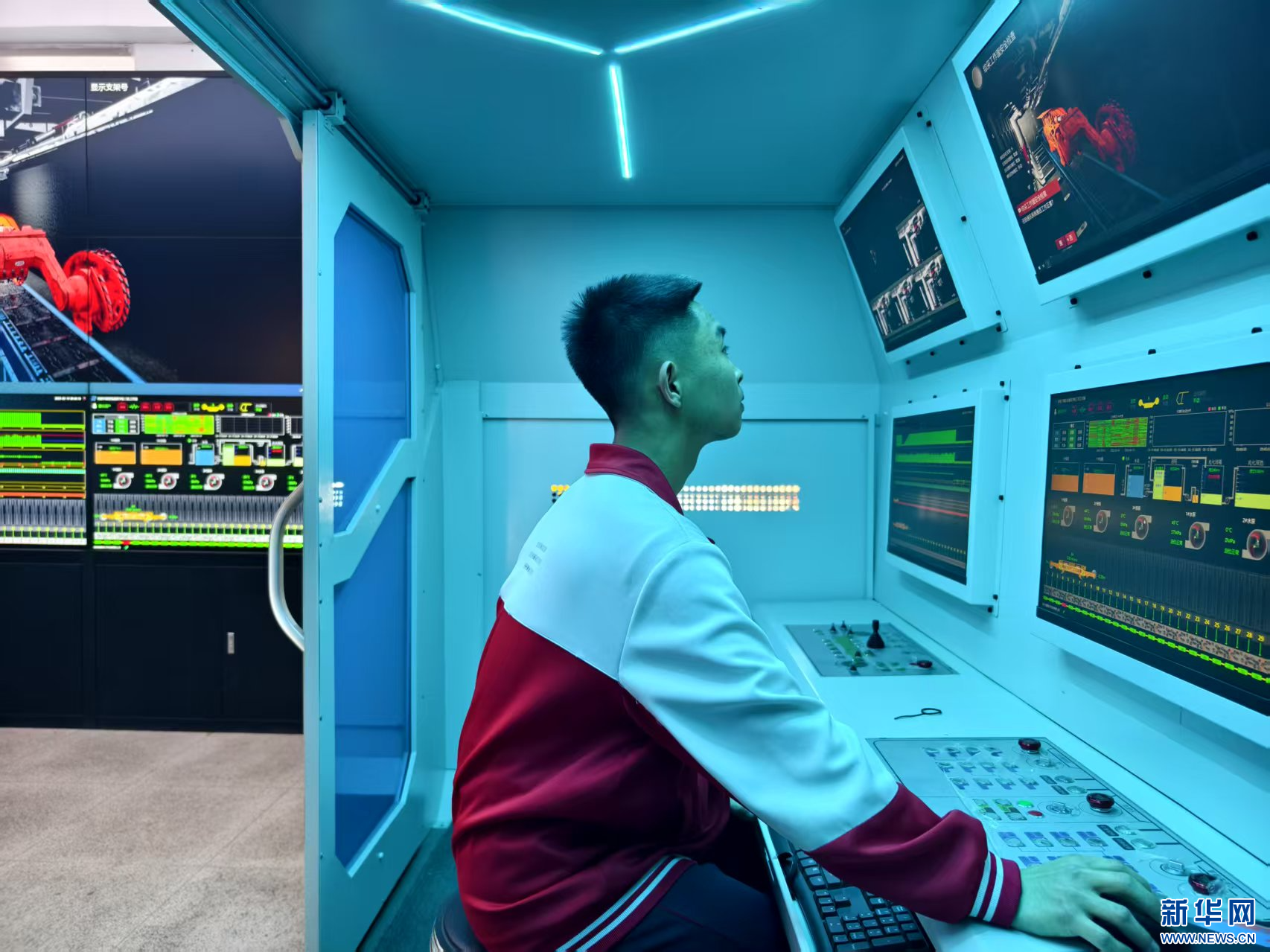 3月15日,准格尔旗职业高级中学学生用模拟机器学习采掘机作业。新华网 杨腾格尔 摄