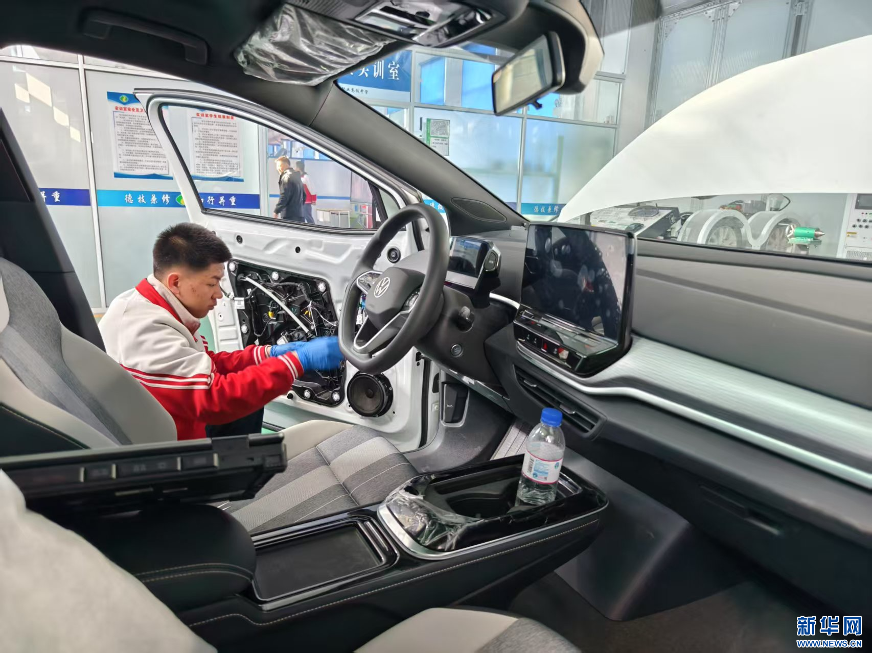 3月15日,准格尔旗职业高级中学学生在熟悉新能源汽车结构。新华网 杨腾格尔 摄