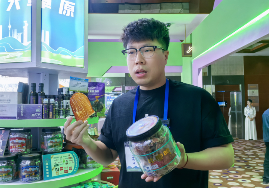 呼伦贝尔市一家企业负责人介绍牛肉干创新产品“牛脆脆”。新华网 郝芳芳 摄