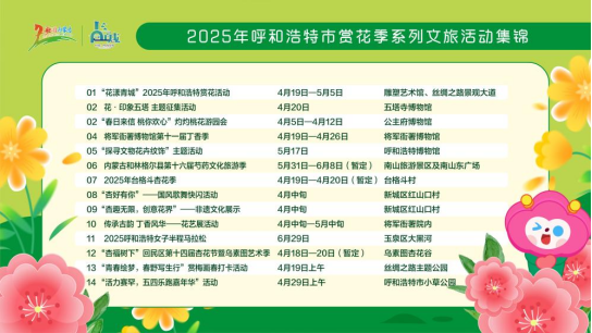 “花漾青城”主体活动将于4月19日在呼和浩特雕塑艺术馆正式启动,持续至5月5日。围绕榆叶梅盛放的丝绸之路大道展开的系列赏花活动,包含文创集市、“开往春天的巴士”赏花公交专线、春日主题集章等。打造“春日花车”(电单车)1000辆,推出4条赏花骑行线路,在“智游青城”小程序发布线上赏花地图,市民可线上线下赏榆叶梅、丁香、海棠等。