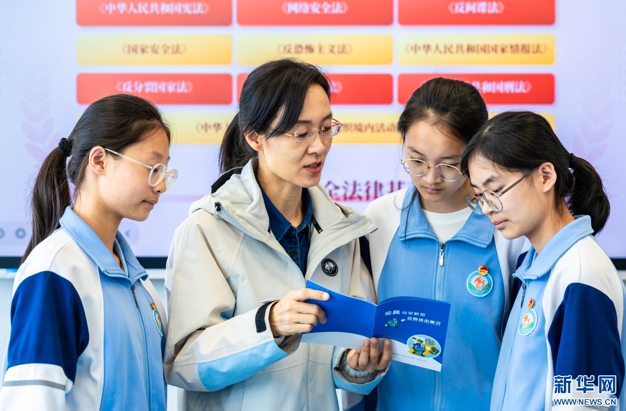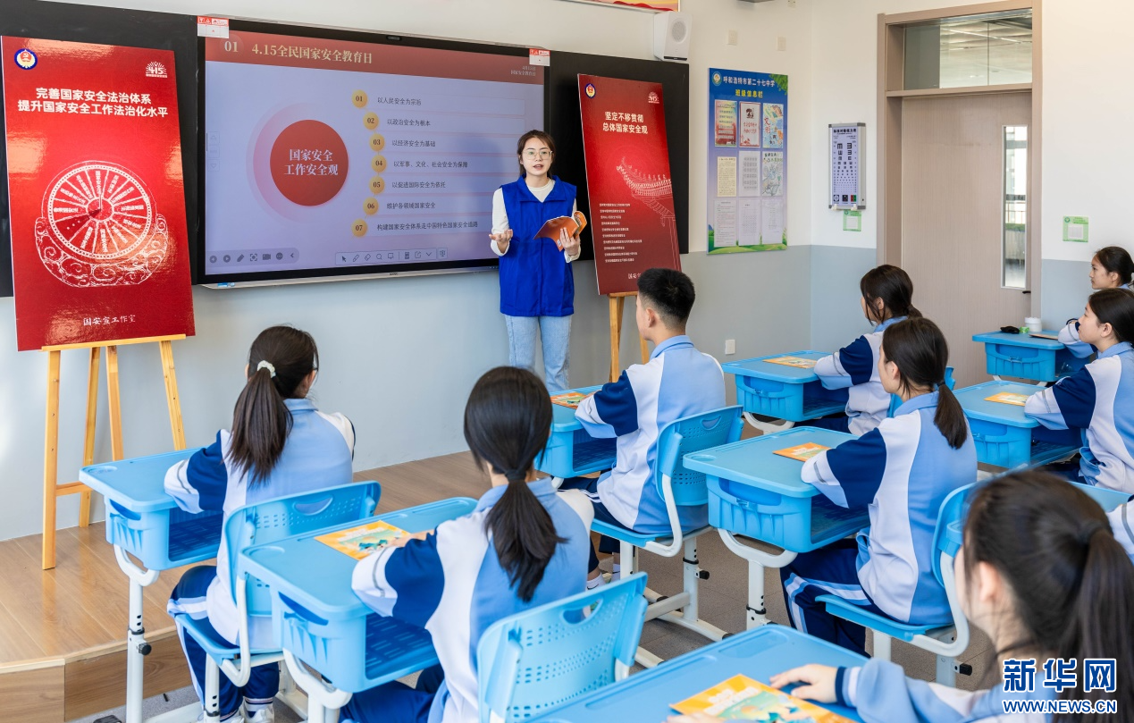 4月14日,呼和浩特市玉泉区委网信办工作人员在呼和浩特市第二十七中学向学生宣讲普及国家安全知识。新华网发(丁根厚 摄)