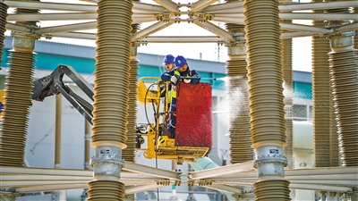检修人员在±800千伏伊克昭换流站直流场区域开展绝缘子清扫工作。