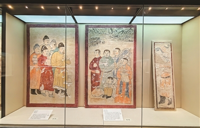 壁画、墓志、画像石也是辽上京博物馆的特色藏品。巴林左旗石匠沟村“大契丹国萧氏夫人墓”出土的两方青砂岩质画像石尤为珍贵。其中一方表现了音乐舞蹈场景,称为“伎乐画像石”,画面中共有11名男子,除最后一人为门吏外,其他均为伎乐人,各人所持乐器不同,有弹拨乐器、吹奏乐器、打击乐器。另一方表现宴饮场景,有执扇、持酒、端果盘的侍女,还有各司其职的侍卫,称为“侍宴画像石”。