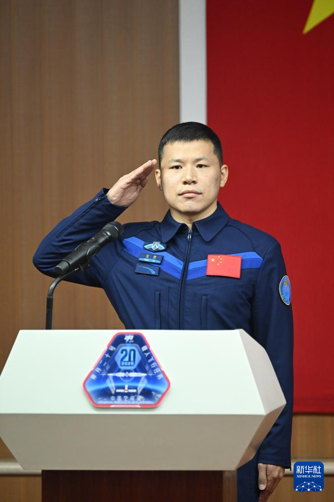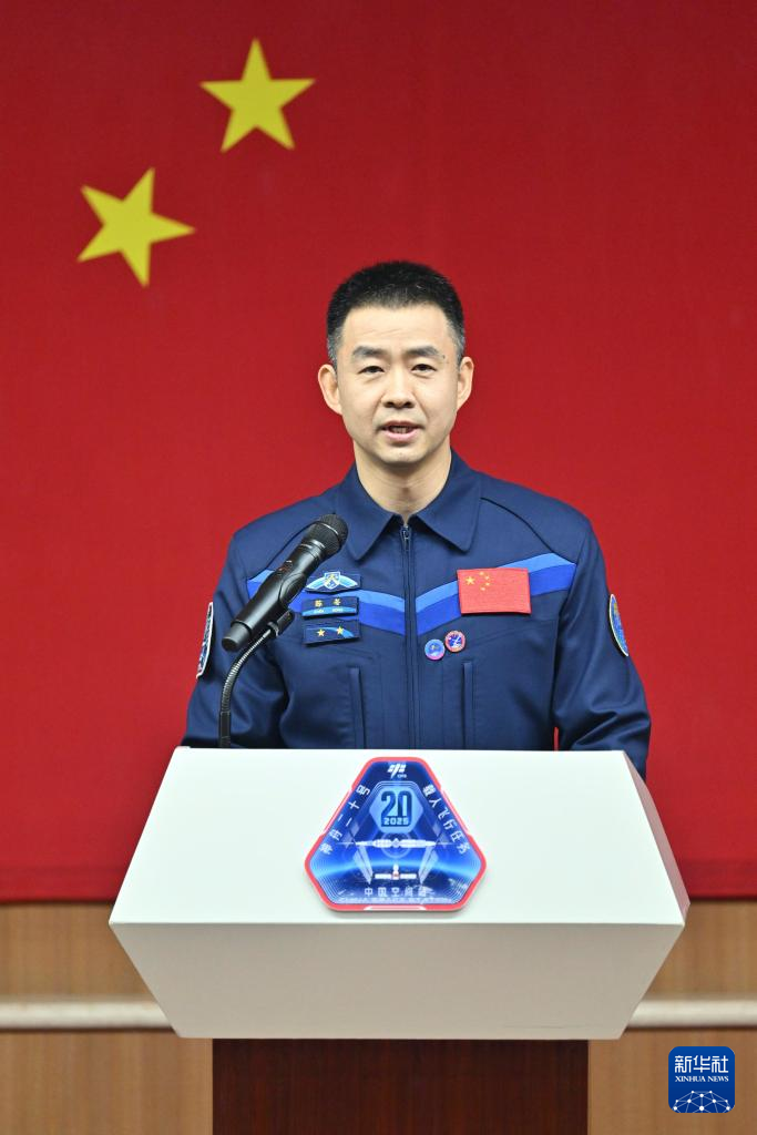 4月23日,神舟二十号载人飞行任务航天员陈冬、陈中瑞、王杰在酒泉卫星发射中心问天阁与媒体记者集体见面。这是航天员王杰与媒体记者见面。