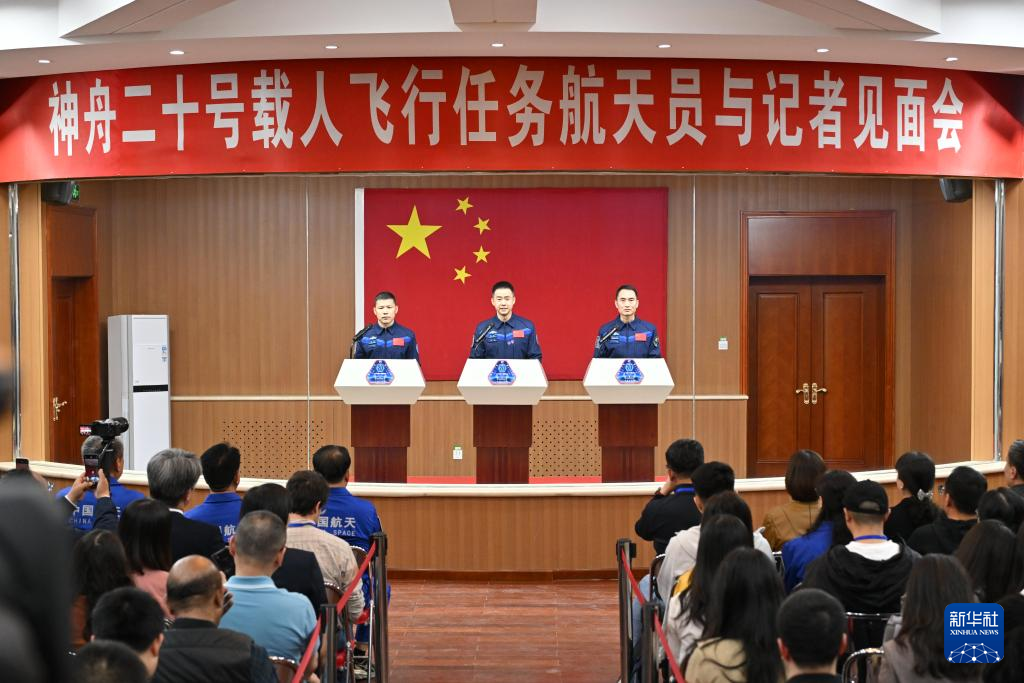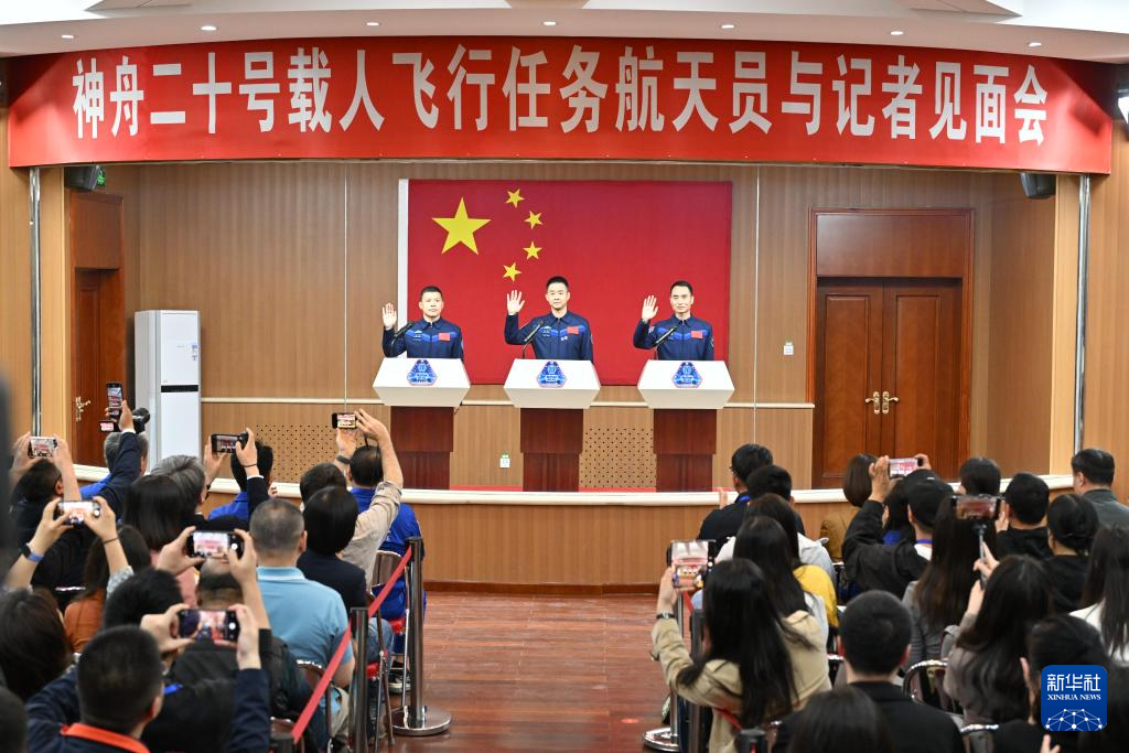 4月23日,神舟二十号载人飞行任务航天员陈冬(中)、陈中瑞(右)、王杰在酒泉卫星发射中心问天阁与媒体记者集体见面。