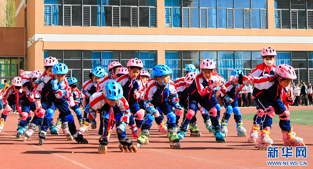 4月28日,呼和浩特市赛罕区腾飞路小学2025年春季运动会开幕式上,滑轮方阵在入场。新华网发(侯乐 摄)