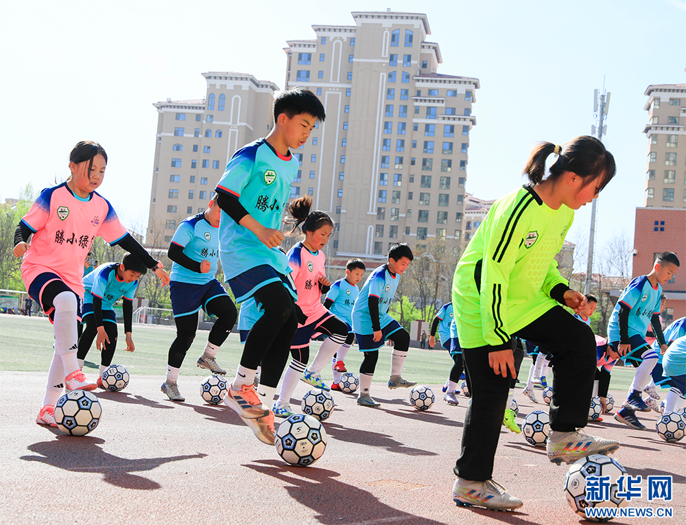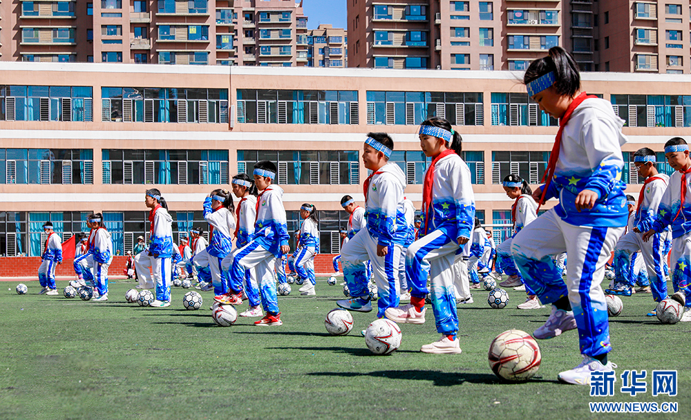 4月28日,呼和浩特市赛罕区腾飞路小学2025年春季运动会开幕式上,学生展示足球韵律操。新华网发(侯乐 摄)