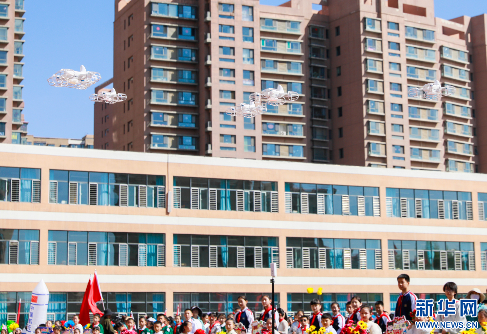 4月28日,呼和浩特市赛罕区腾飞路小学2025年春季运动会开幕式上的无人机展示环节。新华网发(侯乐 摄)