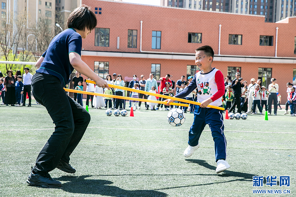 4月28日,呼和浩特市赛罕区腾飞路小学2025年春季运动会上进行的师生比赛。新华网发(侯乐 摄)
