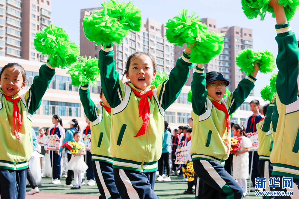 4月28日,呼和浩特市赛罕区腾飞路小学2025年春季运动会开幕式上,啦啦队在入场。新华网发(侯乐 摄)