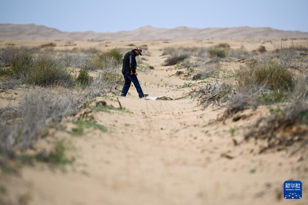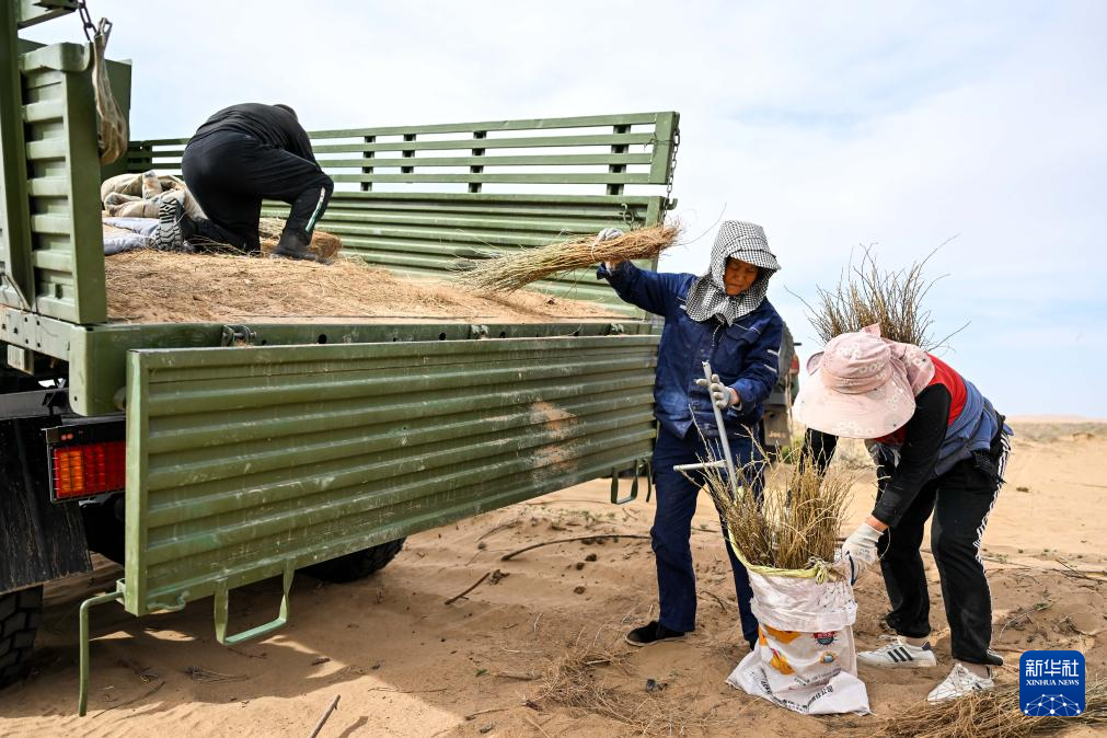 4月28日,在杭锦旗境内的库布其沙漠,治沙工人在搬运柠条。